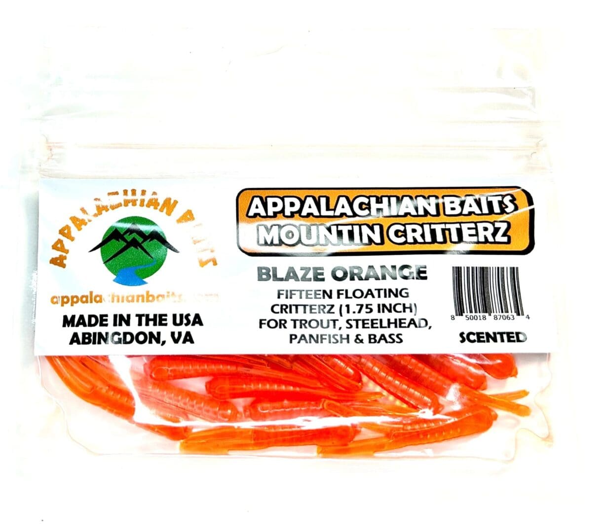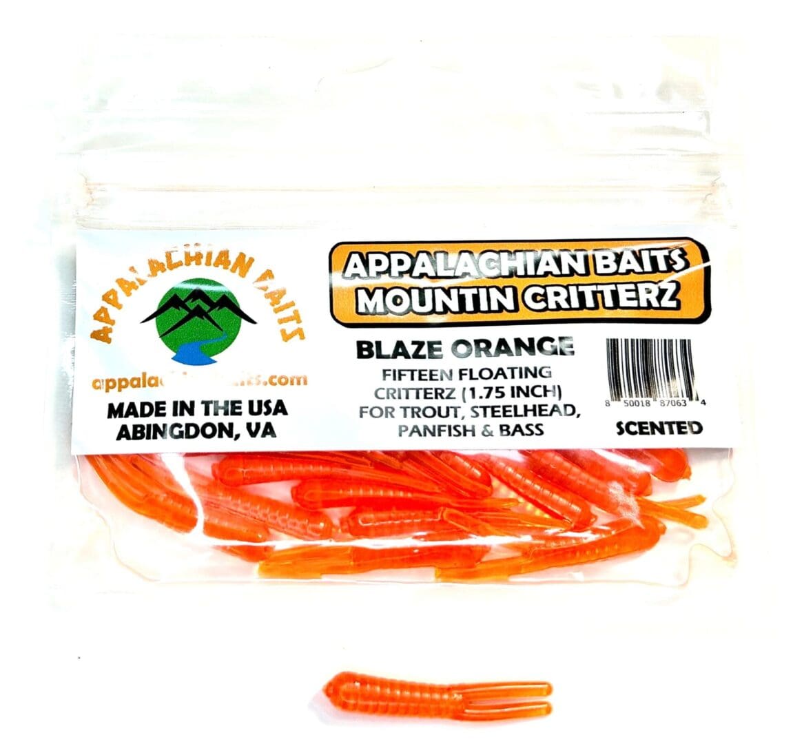 Appalachian Baits BLAZE ORANGE Mountin Critterz are a unique 1¾ inches long. They are a “hybrid” soft floating bait that lies somewhere between a Trout Magnet and a Beetle Grub. Mountin Critterz’s legs are longer than other magnet bait or standard crappie beetle spin bait. The longer legs allow for increased action and appear more natural to trout, steelhead, and panfish. Unlike some companies that soak their baits in scent, all Appalachian Baits Mountin Critterz have the scent infused into each Critterz. BLAZE ORANGE Critterz have a translucent neon orange color that gives off a bright glow to attract fish. These Critterz are a great choice for fishing in low light and/or stained water conditions and can be fished using a jig hook or any crappie spin type lure. Ideal for trout, steelhead, and panfish. Resealable bag contain 15 BLAZE ORANGE Mountin Critterz.