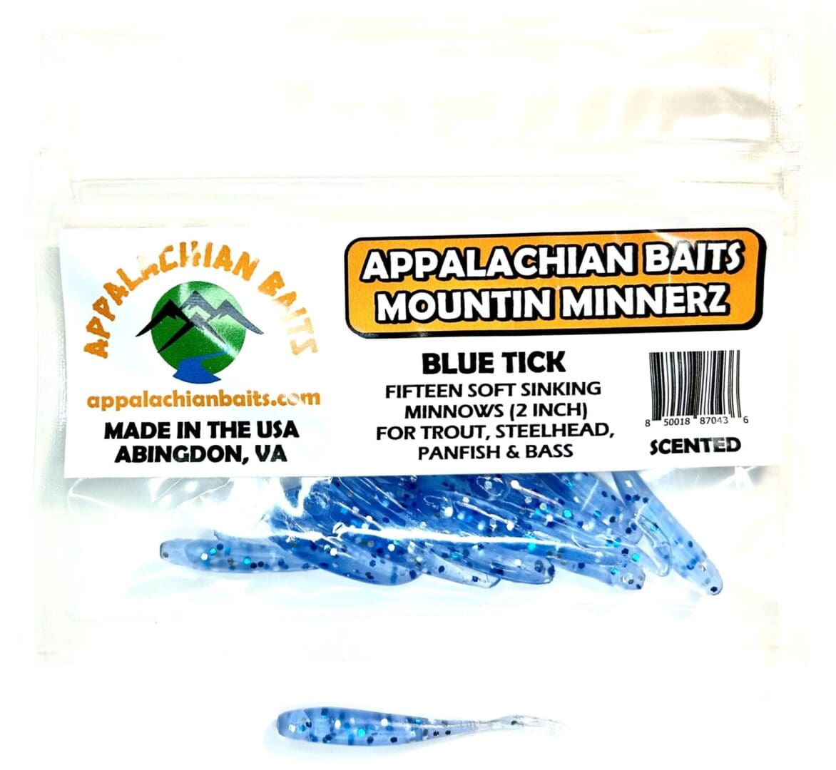 Appalachian Baits BLUE TICK Mountin Minnerz are 2″ split tail, soft sinking, scented, imitation minnows. Unlike some bait companies that soak their baits in scent, all Appalachian Baits Mountin Minnerz have the scent infused into each minnow. Mountin Minnerz is great to use in streams, ponds, lakes, and rivers to entice trout, steelhead, and panfish. It is best to use a jig hook, with or without a bobber, when fishing with BLUE TICK Mountin Minnerz. A light blue color with silver flakes can be a game changer and is best used in low or clear water conditions. Ideal for trout, steelhead, and panfish. Resealable bag contains 15 BLUE TICK Mountin Minnerz.