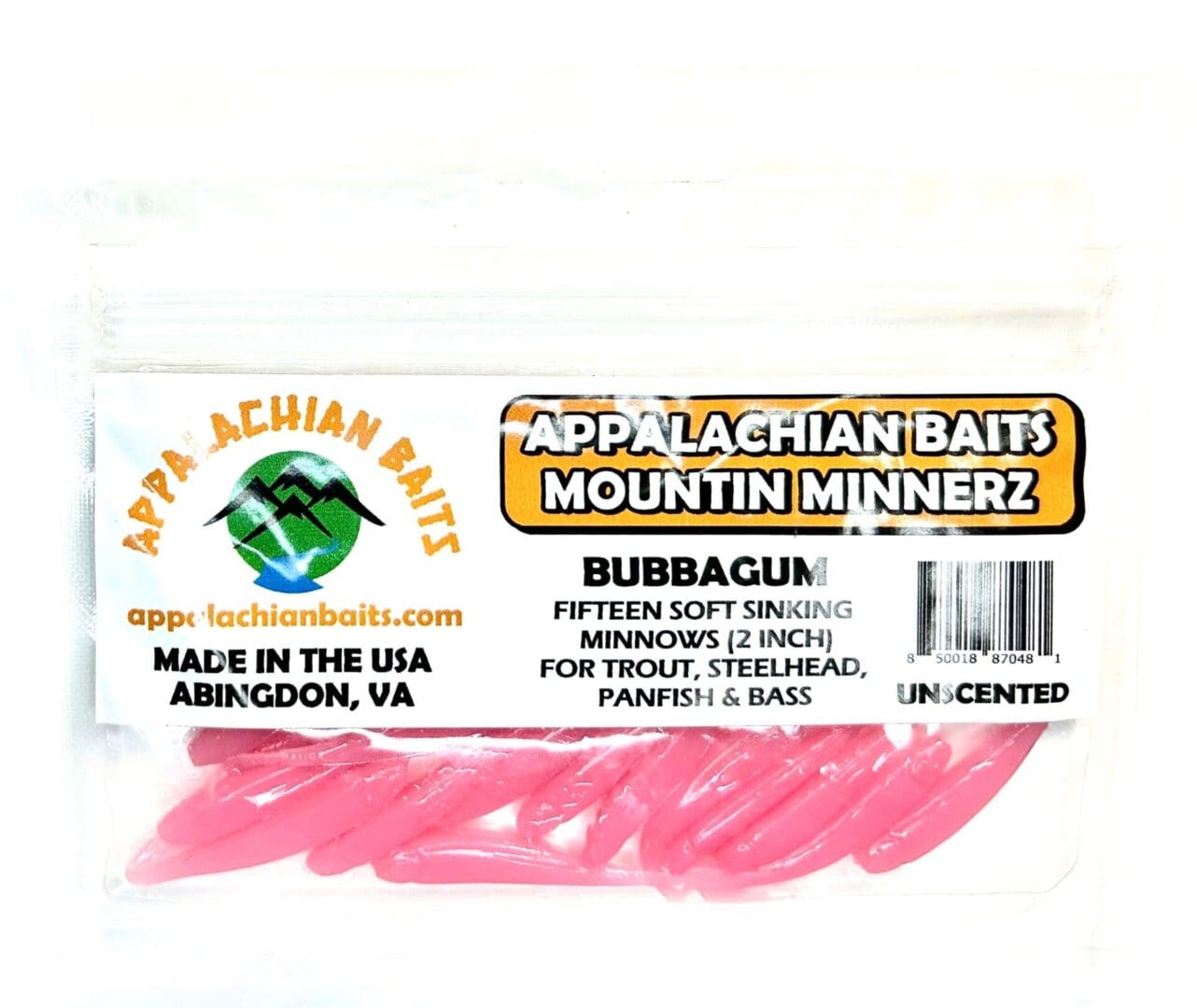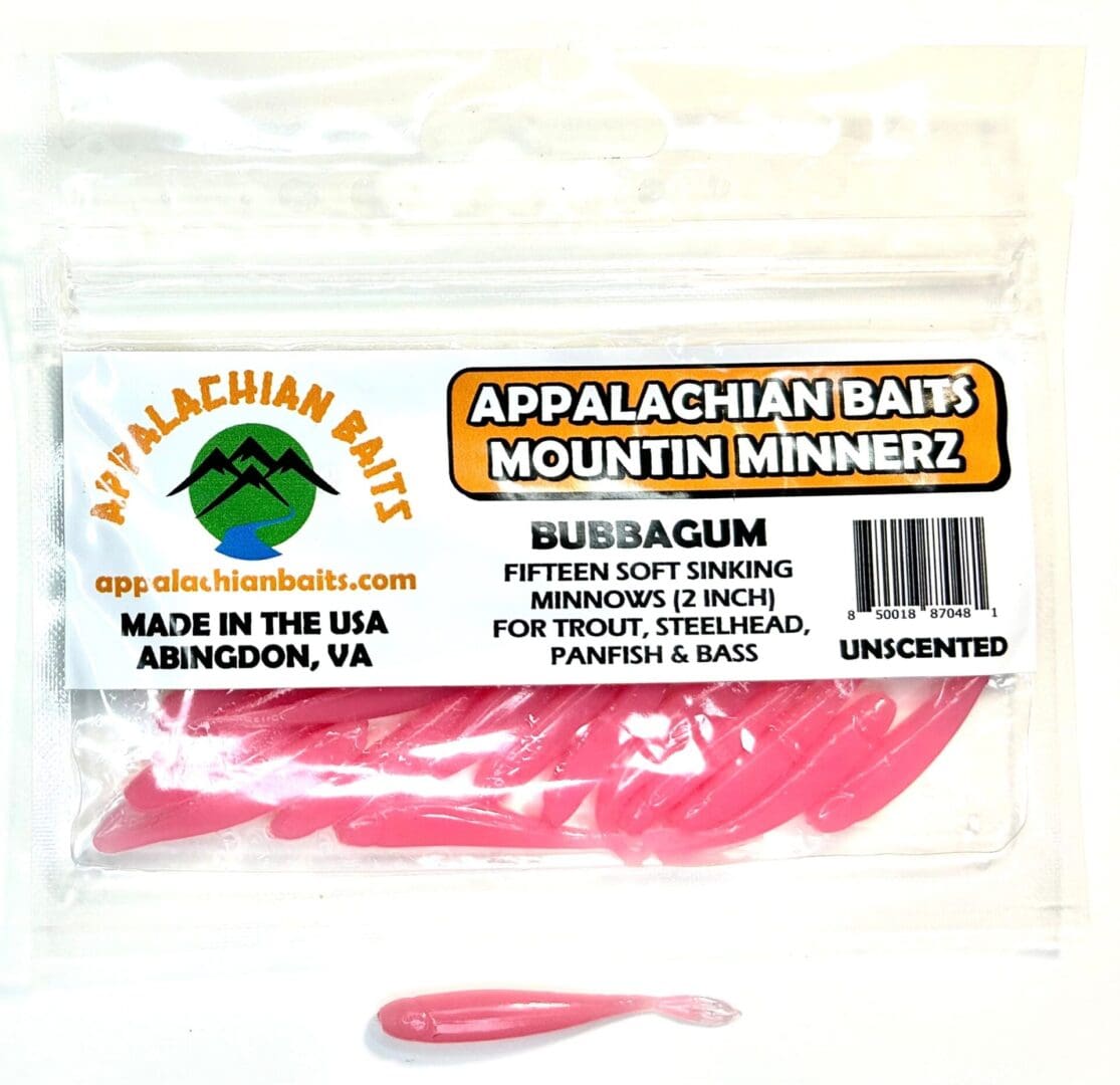 Appalachian Baits BUBBAGUM Mountin Minnerz are 2″ split tail, soft sinking, unscented, imitation minnows. Mountin Minnerz is great to use in streams, ponds, lakes, and rivers to entice trout, steelhead, and panfish. These minnows are an excellent choice to use in Delayed Harvest areas. It is best to use a jig hook, with or without a bobber, when fishing with Mountin Minnerz. BUBBAGUM’S light pink color is a favorite for most fish species and can be used in clear, stained, or restricted waters. Ideal for trout, steelhead, and panfish. Resealable bag contains 15 BUBBAGUM Mountin Minnerz.