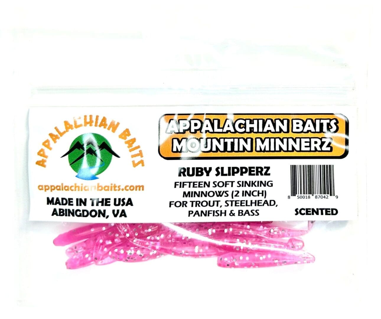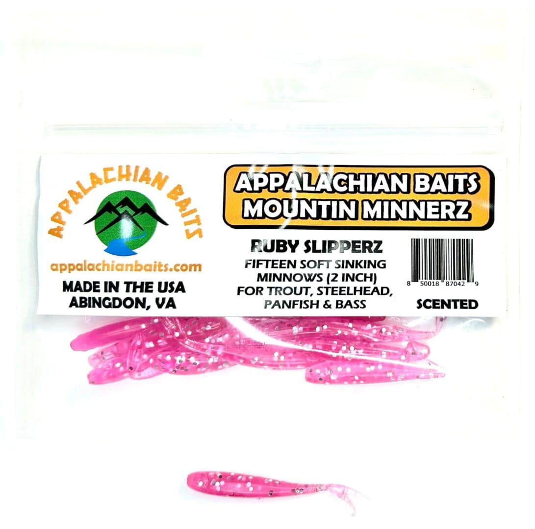 Appalachian Baits RUBY SLIPPERZ Mountin Minnerz are 2″ split tail, soft sinking, scented, imitation minnows. Unlike some bait companies that soak their baits in scent, all Appalachian Baits Mountin Minnerz have the scent infused into each minnow. Mountin Minnerz is great to use in streams, ponds, lakes, and rivers to entice trout, steelhead, and panfish. It is best to use a jig hook, with or without a bobber, when fishing with Mountin Minnerz. A pink color with silver flakes can be a game changer in tough fishing conditions. RUBY SLIPPERZ is a great choice to use in stained water or low light conditions. Ideal for trout, steelhead, panfish. Resealable bag contains 15 RUBY SLIPPERZ Mountin Minnerz.